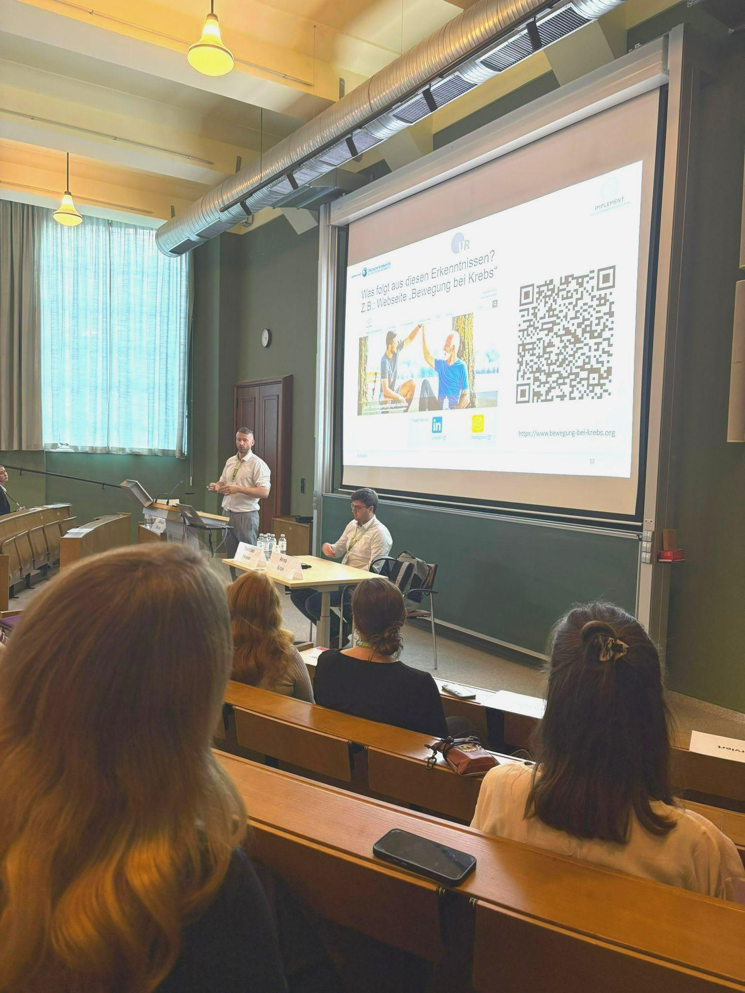 Am Dienstag, 25.09.2025, wurden auf dem DKVF 2025 in Hamburg erste Ergebnisse einer qualitativen Fokusgruppenstudie aus dem IMPLEMENT-Projekt im Rahmen eines Kurzvortrags präsentiert. Es wurde untersucht, was aus der Sicht von Krebspatient*innen die wichtigsten Barrieren und Förderfaktoren für die Teilnahme an einer Sport- und Bewegungstherapie in der Onkologie sind.
