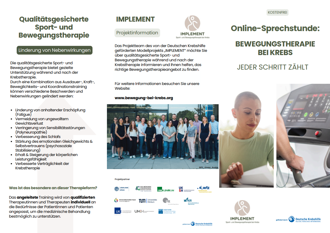 Die Angabe Ihrer personenbezogenen Daten, insbesondere von Gesundheitsdaten, erfolgt freiwillig. Ihre Anfrage wird im Rahmen des IMPLEMENT-Projekts gegebenenfalls an zuständige Stellen oder Personen innerhalb des Klinikums der Universität München (KUM) weitergeleitet. Darüber hinaus werden Ihre Nachricht sowie Ihre Kontaktdaten – sofern dies zur Bearbeitung Ihrer Anfrage im Rahmen der Sportberatung erforderlich ist – an Mitarbeitende des IMPLEMENT-Projekts sowie an die projektbezogenen Kooperationspartner Universitätsmedizin Essen (Sportberatung für junge Erwachsene) und das Klinikum rechts der Isar der Technischen Universität München (Sportberatung für Erwachsene) weitergeleitet. Eine darüberhinausgehende Weitergabe an unbeteiligte Dritte erfolgt nicht.
